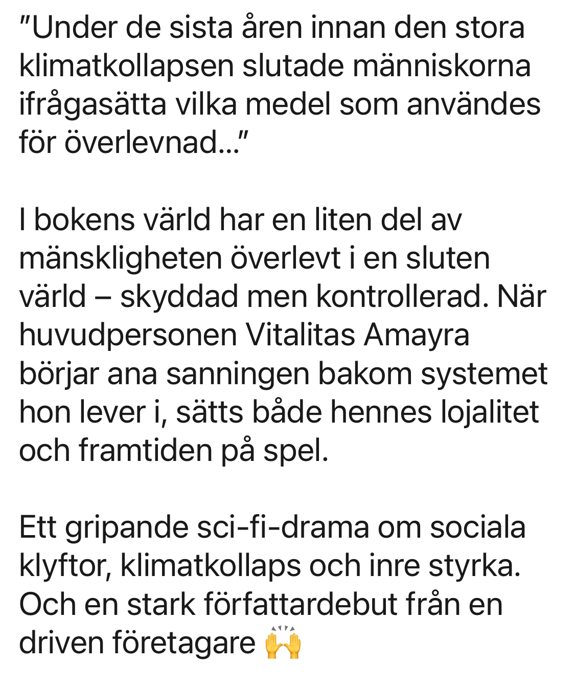 Vitalitas Amayra är uppfostrad till passivitet. Hennes plats är vid sin nobilis sida – stilla, lojal, lydig. Men när det livsuppehållande systemet börjar svikta och klyftan mellan de höborna och arbetarstaden blir ohållbar, börjar sprickorna även växa inom henne.